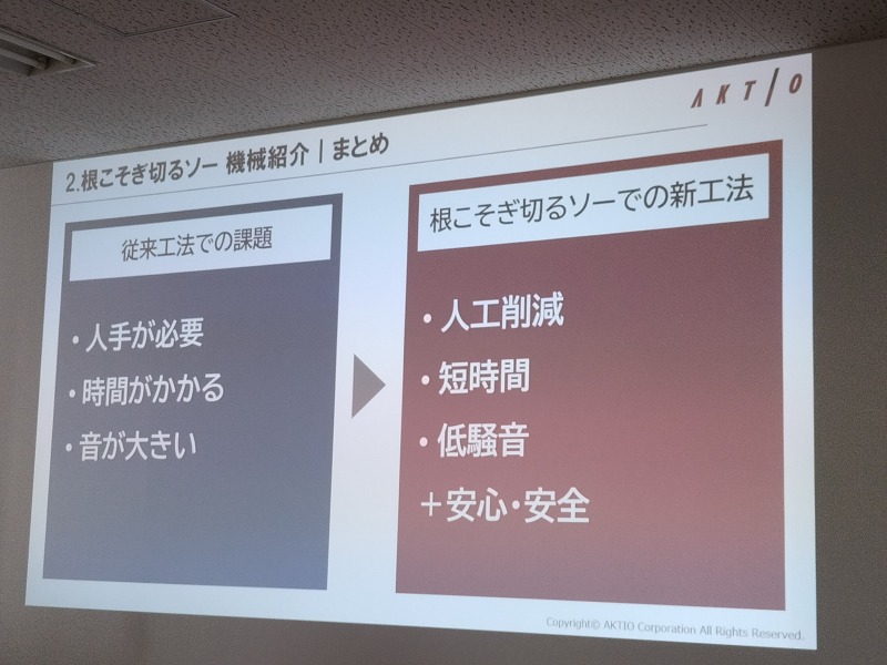 また、作業効率の面でも優れており、従来の人力による伐根作業に比べて作業時間を約3分の1に短縮。1日あたりの伐根本数は従来の2~3本から6~7本へと大幅に向上した。これにより、作業時間だけでなく必要人員の削減にもつながっているとのこと。