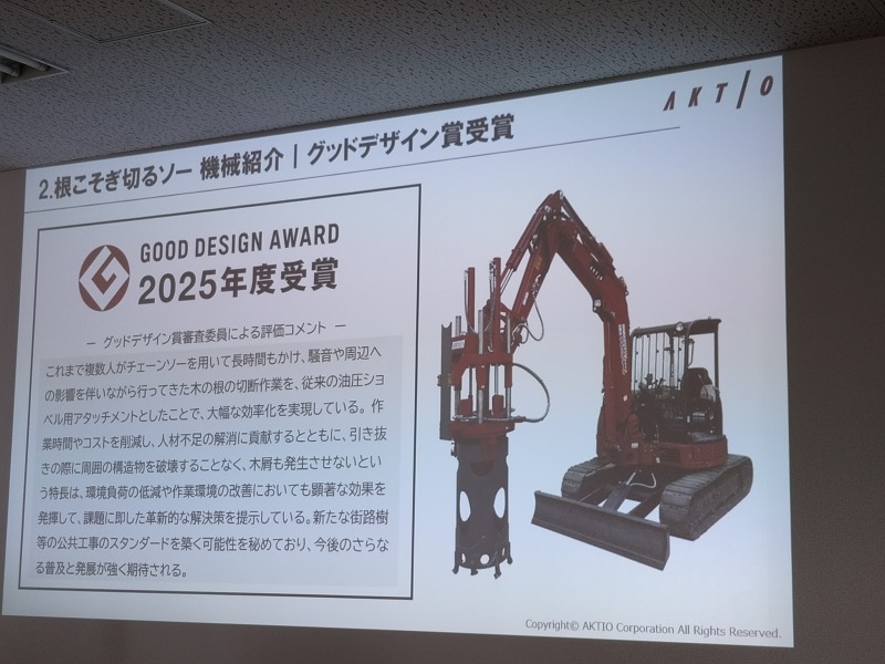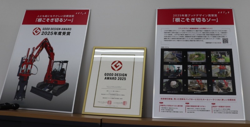 株式会社アクティオは、街路樹伐採製品「根こそぎ切るソー」が2025年度グッドデザイン賞を受賞したことを発表し、11月6日に受賞記念お披露目会を開催。バックホーを使った実演も行われ、実際の伐根作業が行われた。
