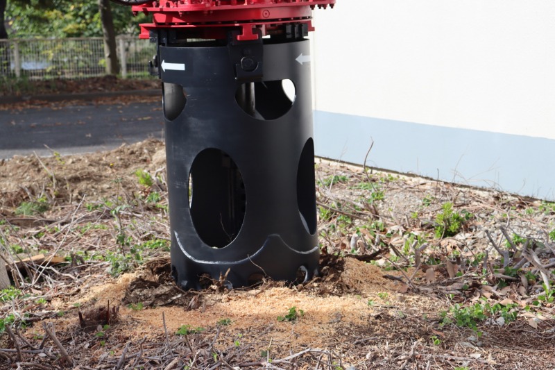 「根こそぎ切るソー」は、バックホーに円筒形のホールソーを装着し、切り株にかぶせてゆっくりと回転させることで地中の根を安全かつ効率的に切断する機械である。