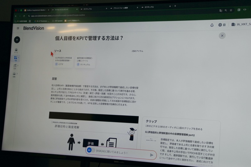 「マネージャーに必要なスキルを知りたい」「KPI管理について学びたい」と入力すると、AIが学習コンテンツを横断的に分析し、該当する動画や資料、さらにはその中の重要なシーンまで提示する。