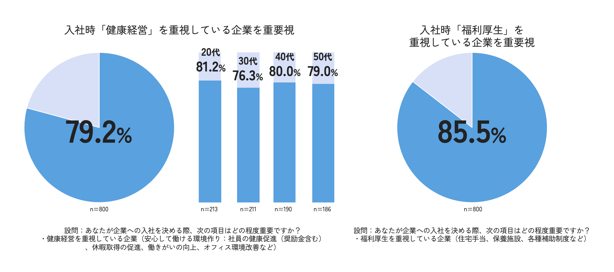 これは、「福利厚生(住宅手当、保養施設、各種補助制度など)」が「重要である」と回答した85.5%に迫る結果となりました。特に20代では健康経営を重視する割合が81.2%と最も高く、これまで採用活動で重視されてきた福利厚生と同水準で重要視されているようです。