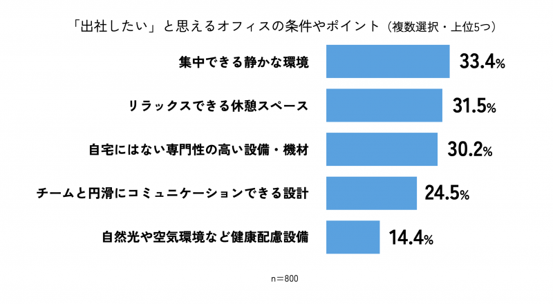 最後に、「出社したい」と思えるオフィスの条件を聞くと、「集中できる静かな環境」 や「リラックスできる休憩スペース」など、ストレスフリーに配慮した環境整備が上位に。次いで「自宅にはない専門性の高い設備や機材」も上位に挙がっており、オフィスならではの利便性や業務効率化を重視する傾向もうかがえる結果となりました。