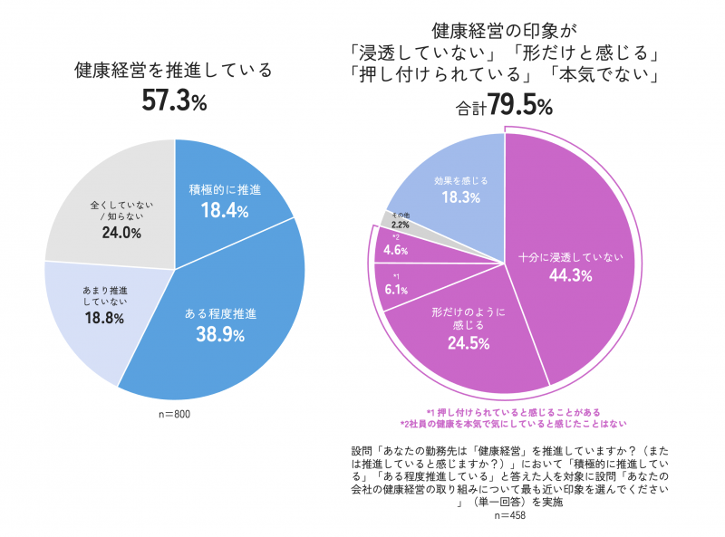 一方で「あなたの会社の健康経営の取り組みについて最も近い印象を選んでください」という質問では「社内に浸透していない」、「形だけと感じる」、「押し付けられていると感じる」 と回答した人が合計で約 8 割となり、形だけの健康経営をしている企業も多いことがうかがえる結果となりました。