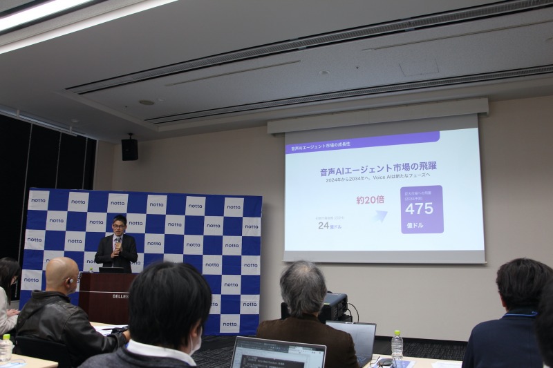 Nottaが注目するのが、音声を起点としたAIエージェント市場だ。資料では、音声AIエージェント市場は今後10年で約20倍規模に拡大すると示されている。