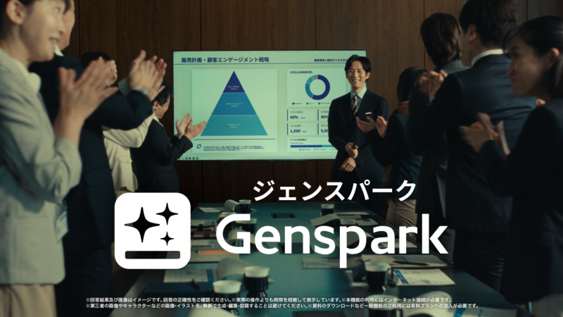 『Genspark』はシリコンバレー発の次世代オールインワンAIワークスペースで、ChatGPT、Claude、Geminiを含む主要なLLMを活用できるスーパーエージェントを特徴とする。資料作成や情報整理、構成づくりといった実務をAIが支える設計になっており、ビジネスシーンでの時短や効率化を想像しやすい。今回のCMでも、デザインや構成に難があった資料が、AIによって洗練された形に変わっていく様子が描かれている。松坂が演じる“資料作成ド下手マン”という設定も、AI活用前後の違いを分かりやすく見せるための仕掛けなのだろう。