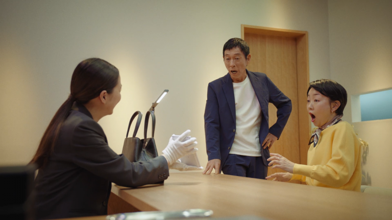 「笑顔の査定室」篇では、さんまさんが女性客のバッグ査定に立ち会うシチュエーションから始まります。緊張する女性客に対し、さんまさんが「個室やから、なんでも聞き放題やで!」と優しく(?)寄り添いつつ、査定額が出ると「あ、ほんまや!」と驚くなど、軽妙で表情豊かなやり取りが見どころです。