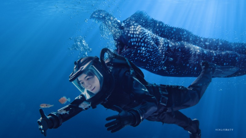 特注のLEDライト搭載ヘルメットと軽量潜水服に身を包んだ高橋さんが、海中で小魚たちを守るシーンは必見。2度目となるワイヤーアクションでは15回以上吊られながらも爽やかな笑顔で演じきり、コミカルかつ迫力のある映像に仕上がりました