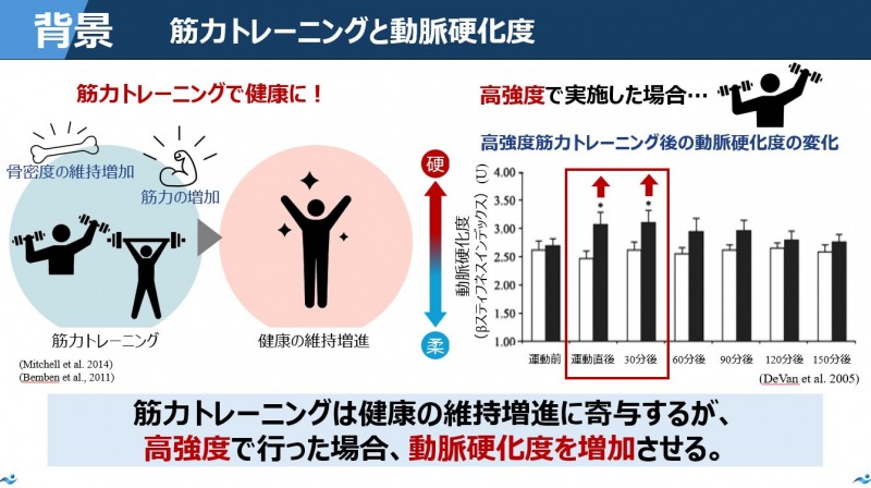 その中で、筋力・筋量の増加や骨密度の増加に寄与する筋力トレーニングが高強度になると、実は一時的に動脈硬化度(血管の硬さ)を上昇させ、血管に負担をかけることが先行研究で確認されているということを解説し、筋トレが健康維持に極めて有効である一方で、「やりすぎ」は血管の柔軟性を低下させる可能性があることを示しました。
