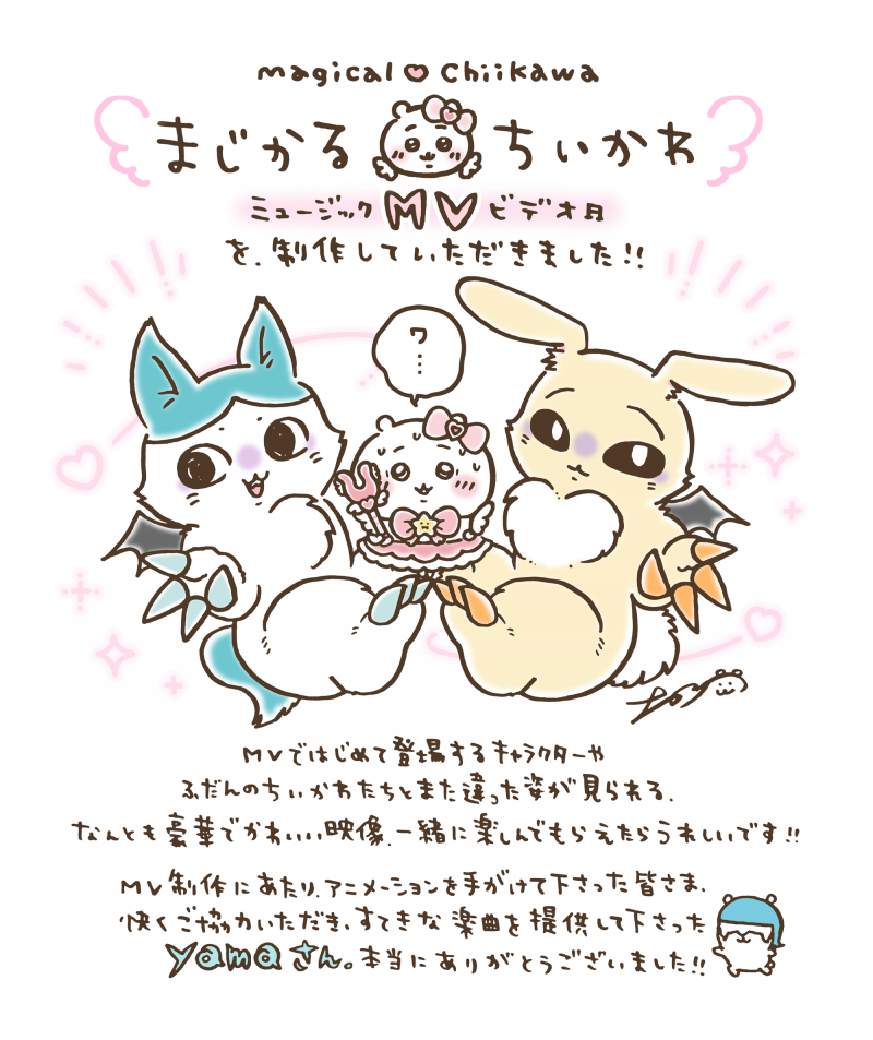 イラストレーター・ナガノ氏が描く人気コミック『ちいかわ』のキャラクターによる魔法少女をモチーフにした作品『まじかるちいかわ』と、人気アーティスト・yamaがコラボしたスペシャルミュージックビデオ『マジカルシンドローム』がYouTubeにて公開されました。