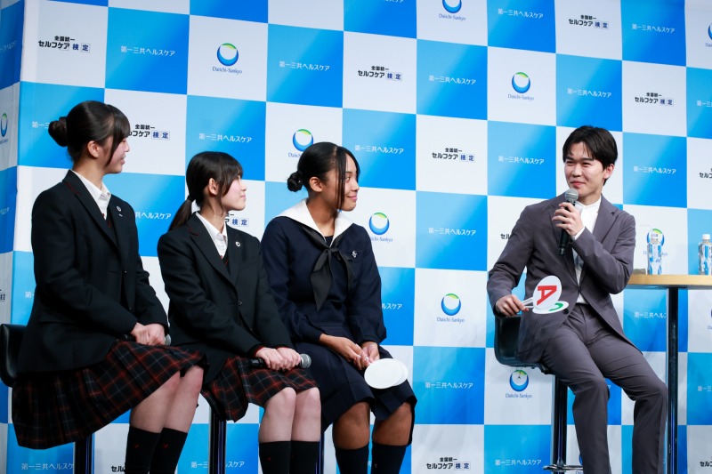 イベント当日、「セルフケアアカデミー」の取り組みの一つである出張授業でセルフケアを学んだばかりの高校生3名も登壇し、鈴木とともにセルフケアクイズに挑戦した。