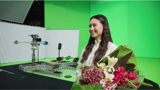 撮影では、二階堂さんが定番の白いワンピース姿でスタジオ入り。背景がグリーンバックのみというシンプルな撮影スタジオで、あたかもそこに“ふどうさん”がいるかのように想像しながらの共演シーンに挑みました。