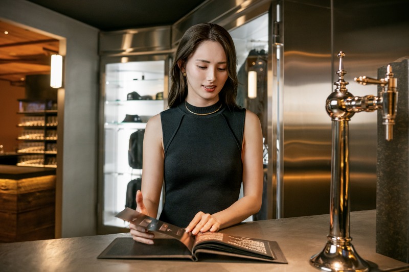 「サッポロ生ビール黒ラベル THE BAR」を訪れるのは初めてという蒼瀬くるみさん。銀座駅直結の黒を基調としたスタンディングカウンターが広がる店内に足を踏み入れた彼女は、「CMにそのまま出てきそうなかっこいい大人の空間。駅から近いとサクッと寄れて帰れるのがいいですね」とお店の第一印象を語りました。以下、インタビューを通して店舗の魅力をリポートします。