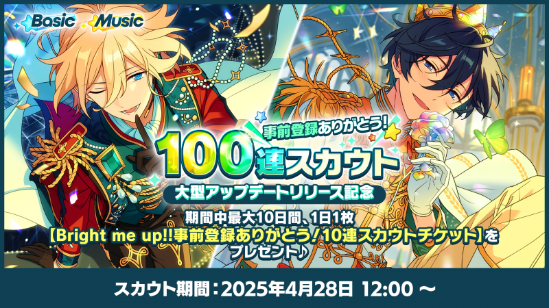 期間中最大10日間、1日1枚【Bright me up!!事前登録ありがとう!10連スカウトチケット】をプレゼント。さらに、10日目には★5カードが1枚以上確定の【Bright me up!!事前登録ありがとう!★5確定10連スカウトチケット】がもらえます。合計で100連分の無料スカウトチケット(内、★5カード1枚以上確定)が入手できますので、忘れずにチェックすることをおすすめします。スカウト期間は4月28日正午から。