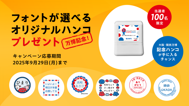 「フォント de スタンプ」で作成したデジタルスタンプが本物のハンコになって届くプレゼントキャンペーン「万博記念!フォントが選べるオリジナルハンコプレゼント」を実施。自分の名前や好きな言葉、推しワード、オリジナルのメッセージなど、選んだ言葉とフォントがリアルハンコになります。