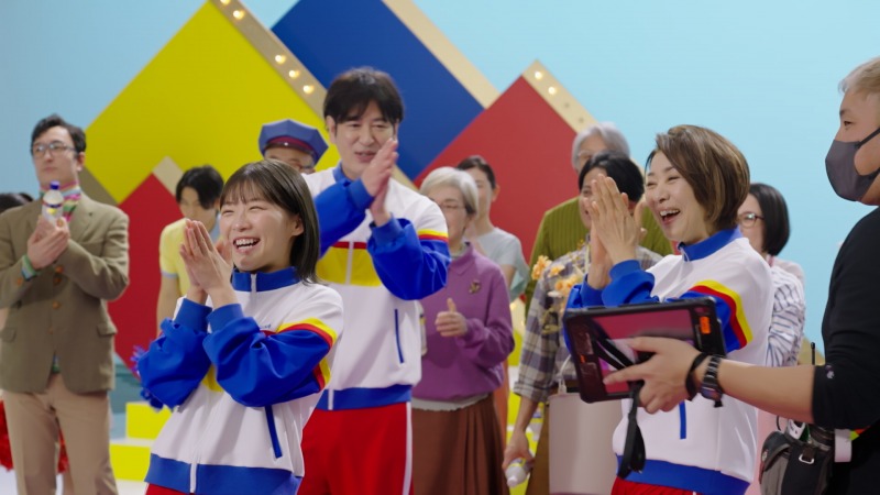 撮影現場は、片平さんと伊藤さんの共演シーンからスタート。2人が笑顔で登場すると、スタジオは一気に明るい雰囲気に包まれました。伊藤さんが木からひょっこり顔を出すシーンでは、絶妙なタイミングと自然な表情で魅力的に演じ、片平さんも「ってことは?」の合いの手を音楽のリズムに合わせて表現。クライマックスのシーンでは大人数で息を合わせる難しさもありましたが、3人を中心に出演者全員が終始笑顔で撮影に臨みました。