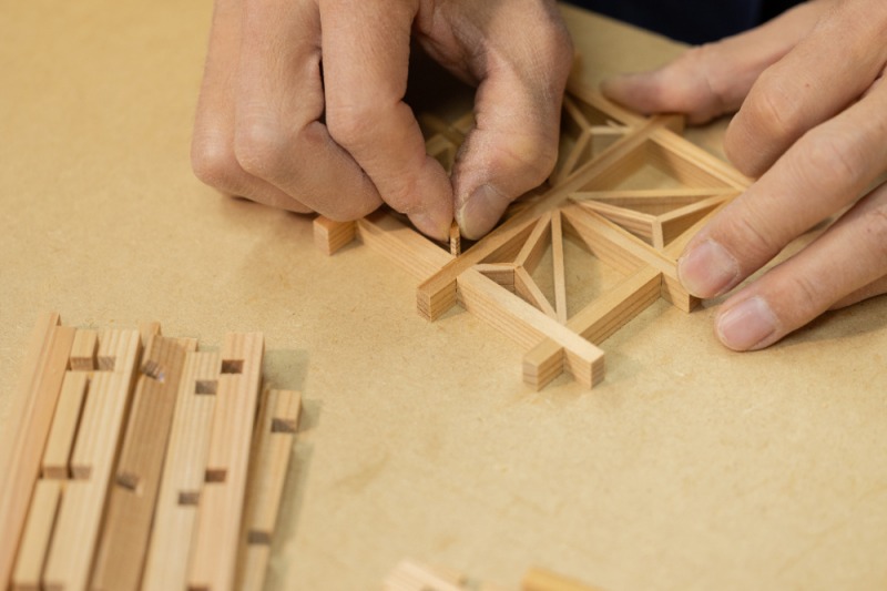 職⼈の⽬と⼿による”⼿しごと”にこだわる「江戸組⼦ 建松」による、組⼦コースター作りのワークショップです。 細かく削った⽊⽚を組み合わせ、麻の葉模様に組み上げます。