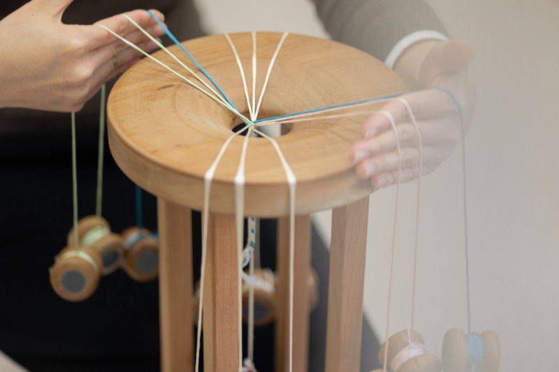 江戸創業以来さまざまな組紐製品の製作を⼿掛ける「道明」による、奈良組という組み⽅を体験し、チャ
