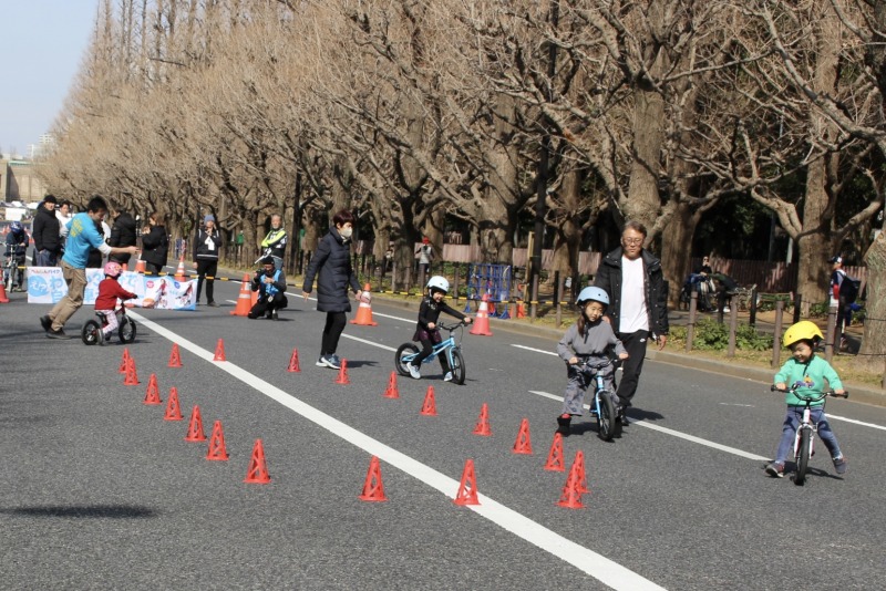 30分で乗れる自転車教室 by へんしんバイクでは3歳から7歳までの子どもたちが参加。ペダルなしの自転車でバランス感覚を養い、その後ペダル付きの自転車に挑戦すると、午前10時の回に参加した子どもは全員乗れるようになった。