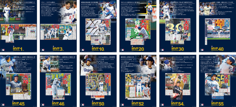 「2025 NL MVP受賞記念 大谷翔平プレミアムフレーム切手セット」には、プレミアムホルダー、フレーム切手シートの他、2種の豪華フォトアートが付属。A4サイズのフォトアート「ホームランシーンセレクション(12枚)」では大谷選手のホームランシーンが表面に。裏面はスポーツニッポンの紙面となっており、見るだけでなく記事を読みながら当日の感動を味わえます。