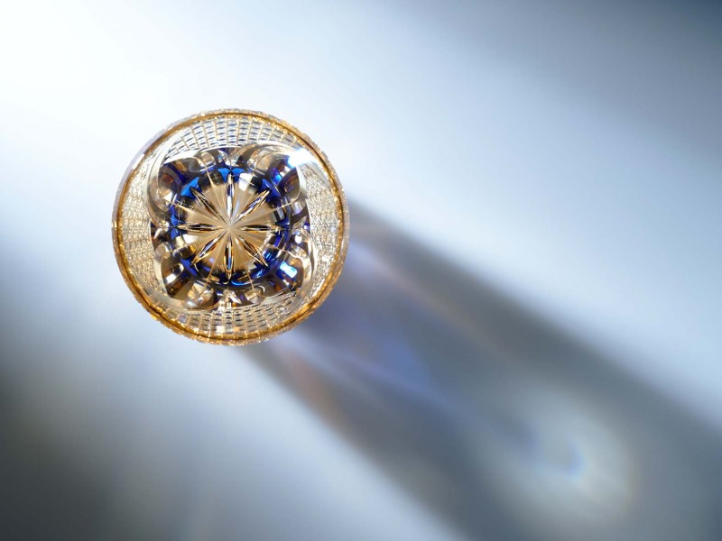 カガミクリスタルで作られた、日本最高峰クラスの美しさを持つ「クリスタルガラス」を使用。透明度があり光の屈折率が高いため、水晶のように光輝くのが特徴です。今回使用したガラスはその中でも高い技術を用いて作られた、青色と琥珀色の2色ガラス。外側の青い面を削ることでもうひとつの色が現れ、2色のグラデーションが優美に輝きます。