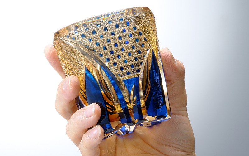 同社はそこに目をつけ、ひとつのグラスを制作しました。最初は青一色だったグラスが、切子職人の手によって魂を宿して輝く。大胆かつ繊細なカットはまさに「大谷翔平」のプレー像を彷彿とさせます。時を超えて継承されてきたもの、そして新たな時代を切り開くもの。そんなふたつの魂が結集した特別な逸品です。