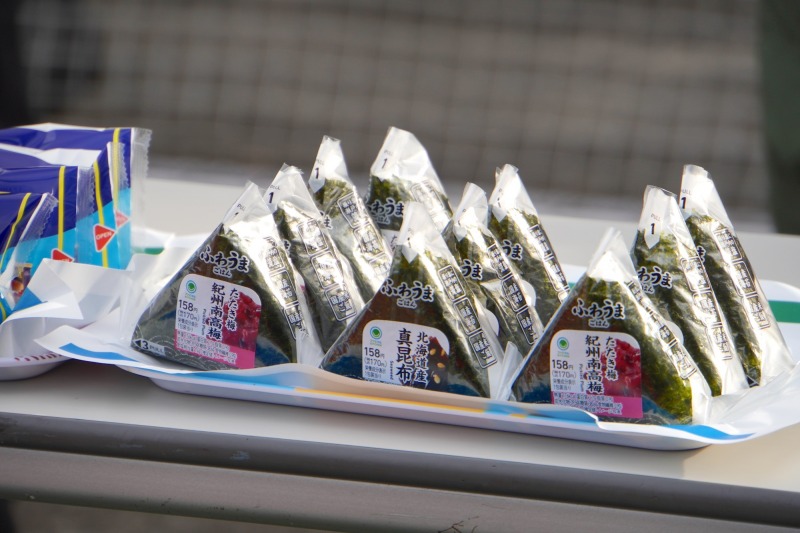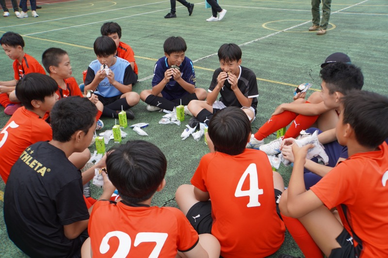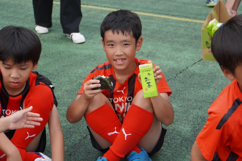 その後は、スタッフからこども達に好きなおむすび2つずつを差し入れ。みんなワクワクしながら順番におむすびを取ると、いつも練習しているグランド上に円を作ってキャプテンの合図を待つ。