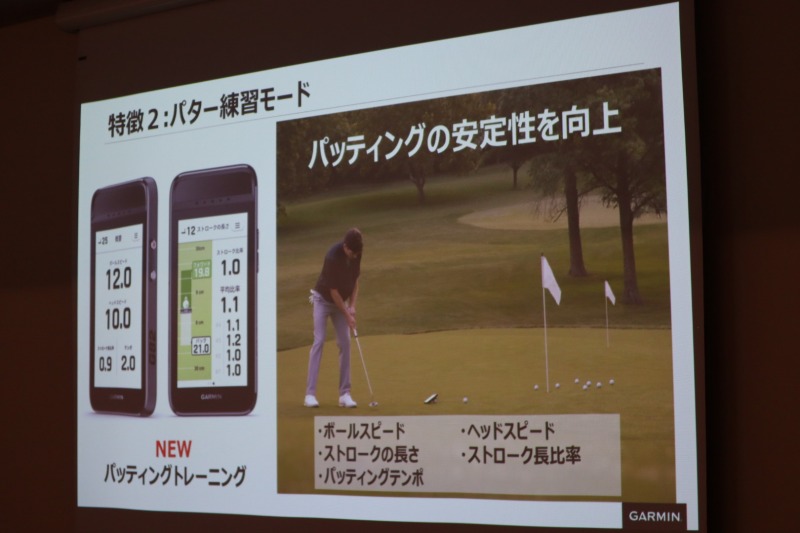 Garminゴルフ製品として初めて搭載されたパター練習モードでは、ボールスピードやヘッドスピード、ストローク長、スイングテンポといった項目を計測でき、バックスイングとフォロースイングの長さも数値で確認可能。