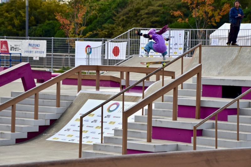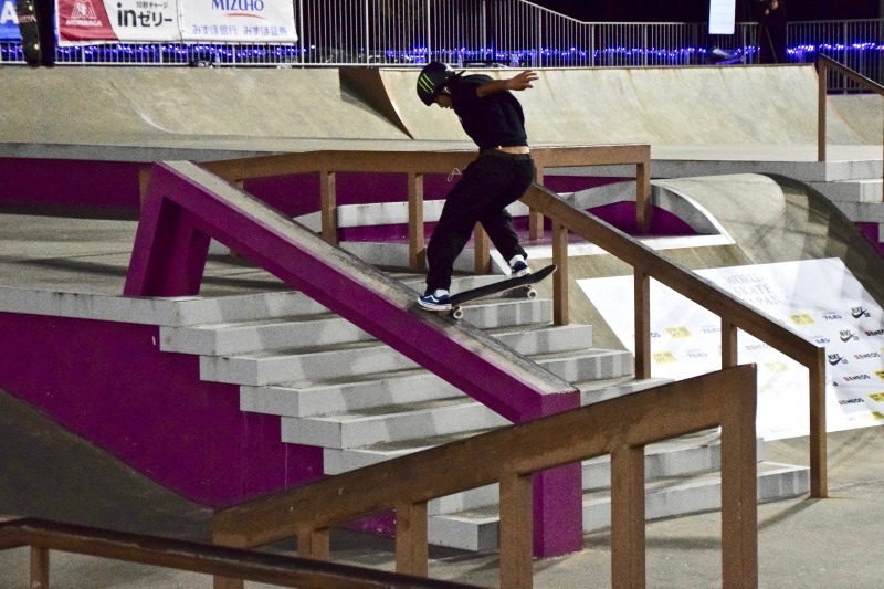 将軍レール以外全てのトリックが回し技、そして驚愕なのが3本ともノーミス(3本合わせて135秒間、超高難度のトリックを24回)という驚異の滑りを見せ、佐々木音憧に次ぐ2位でベストトリックに進む。