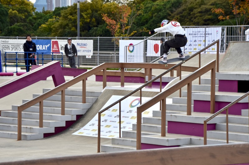 ラン2本目ではラストトリックの、将軍レールでのバックサイド50-50グラインドを時間内に収め、83.66点を獲得。
