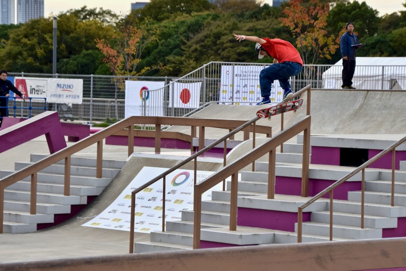 ランでKグラインドからのノーリーフリップアウトを決めたことで他を引き離し、ベストトリックでも1本目に早々と高得点を重ねた織田が今大会を制した。
