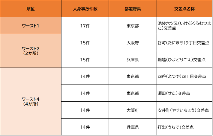 全国の人身事故の半数以上は交差点・交差点付近で発生しており、同マップでは全国の都道府県警察の協力のもと、各都道府県における人身事故件数が多い交差点をランキング形式で紹介。今回のワーストランキングは以下のようになりました。