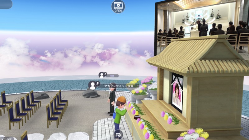 日本庭園をイメージした空間から葬儀会館を模したイベントスペースへと進み、映像や焼香機能を通じて、実際の葬儀に近い体験ができる。アバターを操作し「風ノ間」に入ると、会場ではLIVE映像が流れ、椅子に座って参列したり祭壇の前で焼香と献花もすることができる。こうしたアバターを通じた細かな所作によって、物理的には会場から離れていながらも、葬儀の場や故人とのつながりを意識できる印象を受けた。
