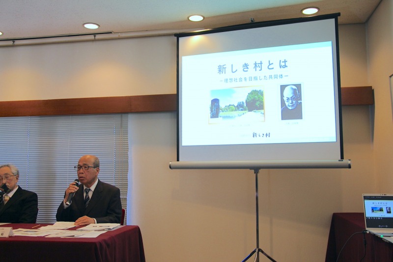 発表会の冒頭で挨拶に立ったのは、理事長の武者小路知行氏。武者小路実篤の孫にあたる同氏は、「実篤が亡くなって50年が経ち、彼の思想を直接知らない世代が大半になった」と語る。