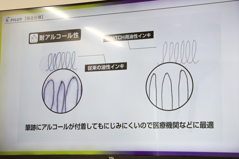 同社は「フリクションボールスイッチ」を実現するために、筆跡の堅牢性に優れた油性インキを新たに開発した。フリクションインキでの筆記と誤って油性インキの筆跡を消去用ラバーで擦ってしまった場合でも、筆跡が擦れにくく、汚れにくいことが特長。「フリクションボールスイッチ」専用の新開発油性インキは、長年にわたる検討と幾度もの開発テストを経て完成したという。