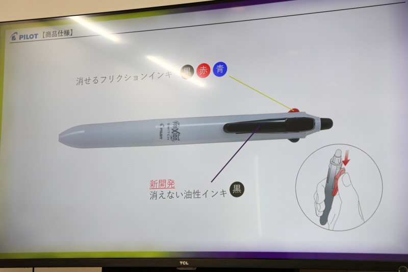 「フリクションボールスイッチ」が誕生したきっかけについて担当者は、ユーザーからの「フリクションと油性が一本になってる多色ボールペンがほしい。持ち替えるのがめんどう」「仕事で使う色々なペンを一本にできたら助かる」という意見があったためと、開発背景を振り返った。