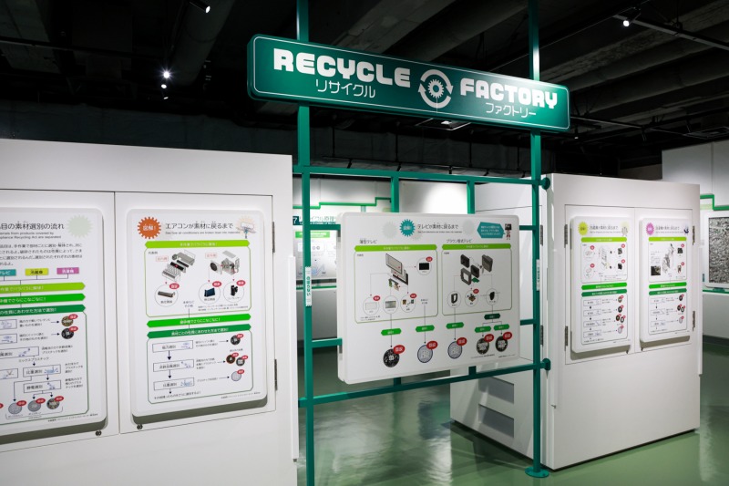 三つ目の空間「RECYCLE FACTORY」は、家電リサイクル工場(リサイクルプラント)で、廃家電がどのようにリサイクルされるのかを体感できる空間。普段見ることができないリサイクル工場で、実際にどのように製品を分解、分別して新たな素材に生まれ変わらせているのかを、臨場感あふれる潜入映像や、原理を応用したゲーム、これらを図にした展示などで学べるコーナーとなっている。