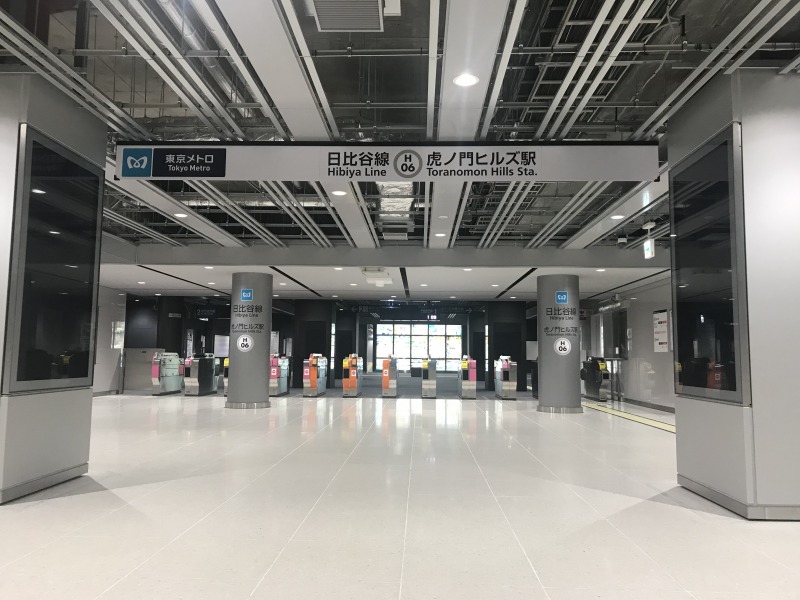 2015年12月に土木工事に着手。日比谷線の営業を継続しつつ、地下1階の順巻き施工と地下2階を掘削する逆巻き施工を同時に行った他、掘削の進捗に伴う地下水位低下範囲を最小限に抑えるWICシステムを用いた「ディープウェル工法」を採用するなど、さまざまな技術を駆使して工期を短縮し2020年6月の供用開始を達成。2023年7月には駅と「虎ノ門ヒルズ ステーションタワー」が繋がり完成形となりました。