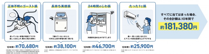 そうなんです。使っていない家電の電源プラグを挿しっぱなしにする「正体不明のゴースト損」は約70,680円、10年以上前の家電を使い続ける「長持ち美徳損」は約38,100円、冷蔵庫の詰め込みすぎなどで生じる「24時間のじわ損」は約46,700円、エアコンの設定温度を上げ下げする「たった1℃損」は約25,900円です。すべてに当てはまると、10年間で大きな金額が発生してしまいます。