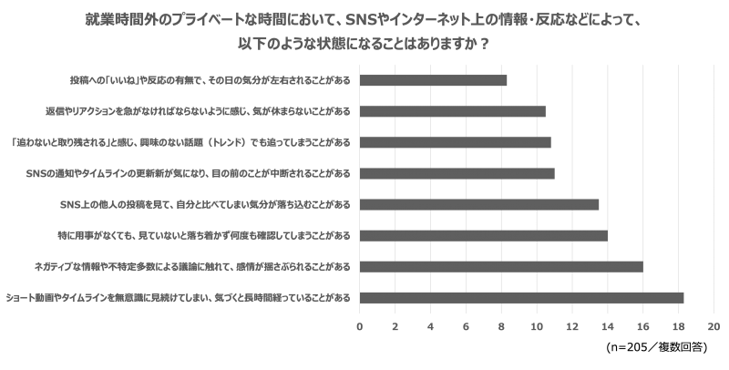 次に、「就業時間外のプライベートな時間において、SNSやインターネット上の情報・反応などによって、選択肢のような状態になることはありますか︖」と質問。およそ 51%の⼈は、選択肢のうち 1 つ以上が当てはまると回答。就業時間外もSNSやインターネットにより⼼の疲れを感じる⼈が多くいることが明らかになりました。