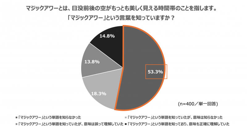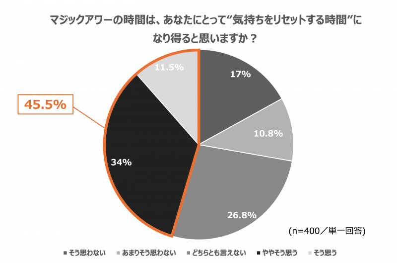 調査ではまず、「マジックアワー」という⾔葉を知っているかを質問。「知らない」と回答した⼈は過半数を占めた⼀⽅ で「マジックアワーは気持ちをリセットする時間になると思いますか?」という問いでは、45.5%のおよそ半数の⼈が「そう思う」、「ややそう思う」と回答。多くの人がマジックアワーの時間に「気持ちのリセット効果」を感じていることが明らかになりました。