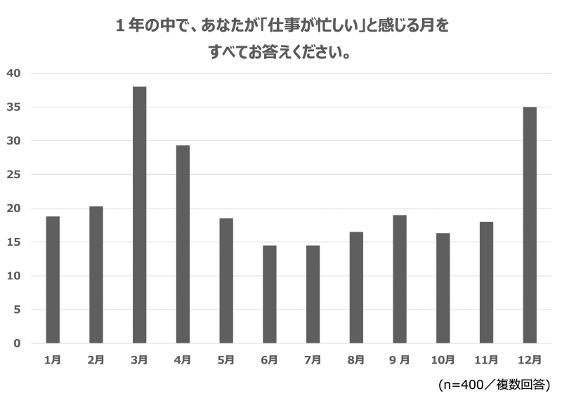 また、「1年の中で、あなたが『仕事が忙しい』と感じる⽉はいつですか」という問いでは「3⽉」「12 ⽉」「4⽉」が多くあがりました。