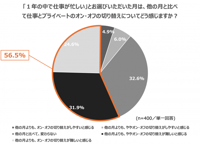 さらに「仕事が忙しい⽉は、他の⽉と⽐べて仕事とプライベートのオンオフの切り替えについてどう感じますか︖」と聞いたところ、「他の⽉よりも切り替えが難しいと感じる」と回答した⼈が24.6%、「やや切り替えが難しいと感じる」と回答した⼈が31.9%という結果に。半数以上の⼈が通常時よりもオンオフの切り替えを困難と感じているようです。