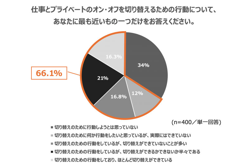 「仕事とプライベートのオンオフを切り替えるための⾏動について、⾃⾝に最も近いものを回答してください」という質問では、 6割以上の⼈が「切り替えのための⾏動をとっている(またはとりたい)」と回答。しかし「切り替えができている」と⾔い切れない層も多く⾒られ、多くの人が「適切な切り替え⽅法」を探している現状がうかがえました。