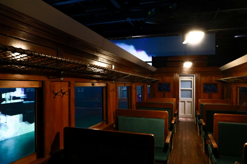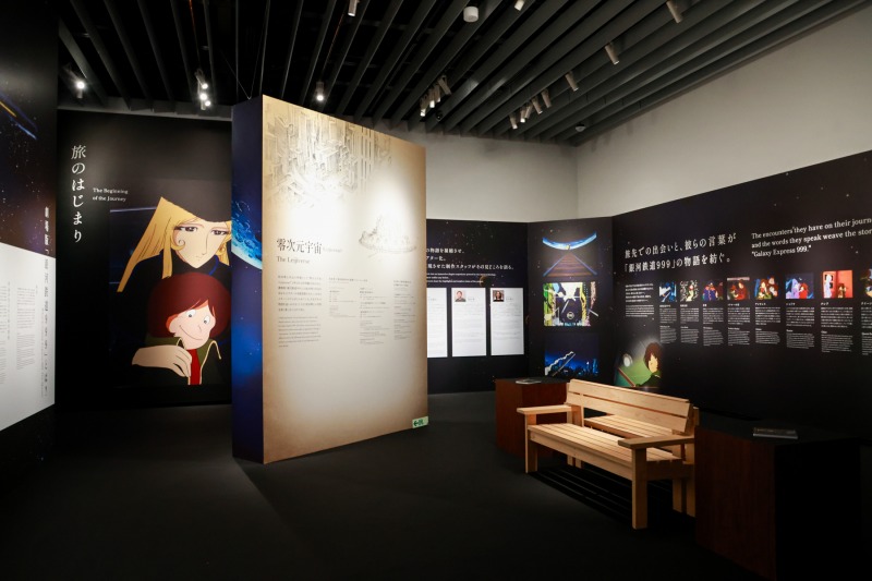 ホワイエには銀河鉄道をイメージした客車が置かれ、客席に腰掛けると車窓には映像の銀河が広がり、地球へ向かう999号が走り抜ける。会場は大きく3つに分かれており、第1会場はイマーシブシアター、第2会場は「言葉の回廊」、第3会場は「物語の裏側へ」となっている。