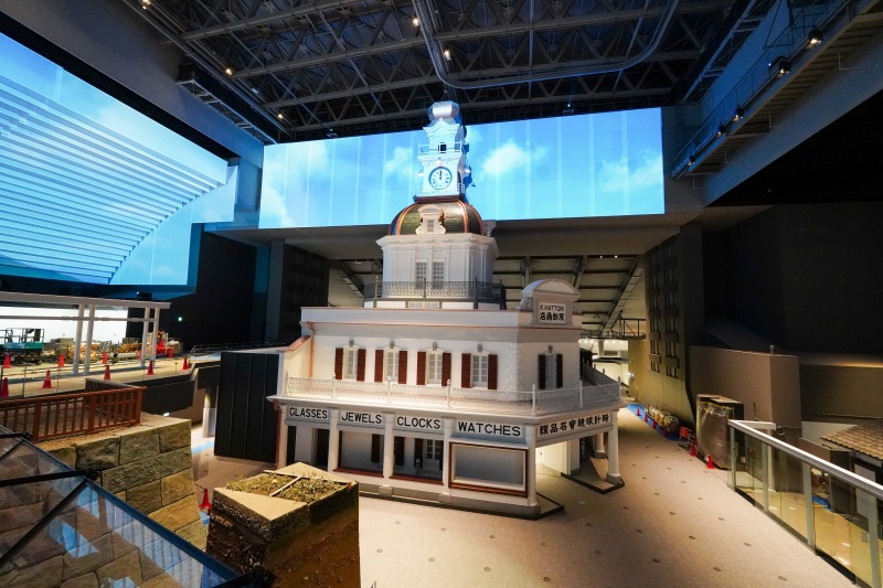 その後は藤森館長や重松さんと共に巡る「えどはく館内ツアー」を実施。重松さん監修のアプローチデザインを紹介すると共に、新設の「服部時計店」の大型模型が一部先行公開されました。これは常設展示室で存在感を放っていた大型模型「朝野新聞社」を、史実に基づき「服部時計店」へと建て替えたものとなります。正面玄関を東京ゾーンの入口として、そこを通り抜けると文明開化東京の世界が広がり、時代の移り変わりが感じられます。