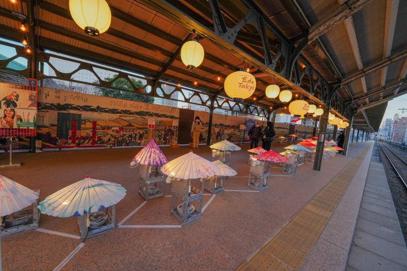 JR両国駅3番線ホームで始まった「江戸東京博物館リニューアルオープン100日前記念イベント」では、鴨南蛮の振る舞いや和傘を使ったイルミネーション、江戸と令和の文化・慣習の見比べ展示などを実施。江戸の風情を体感することができる催しが満載となっています。
