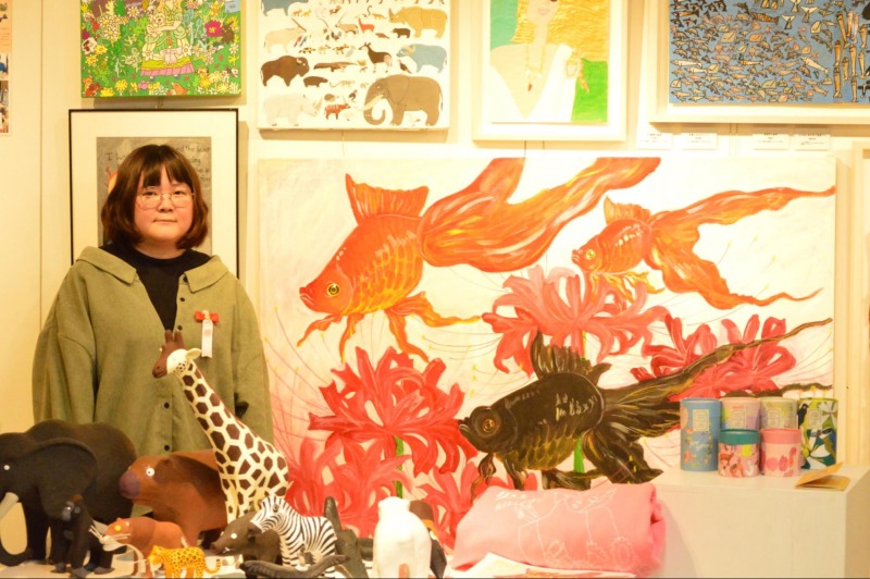 「この金魚の絵ってどんな気持ちで描かれましたか?」と中津川氏が聞くと「金魚が自由に泳いでる絵を描きたくて、私が自由にいろんなところに行けないので金魚に絵のなかに自由に泳いでもらって、またその絵がいろんなところで展示されることによっていろんなところに自分も足を運ぶことができるとおもうのでこの金魚を描きました」と口に。
