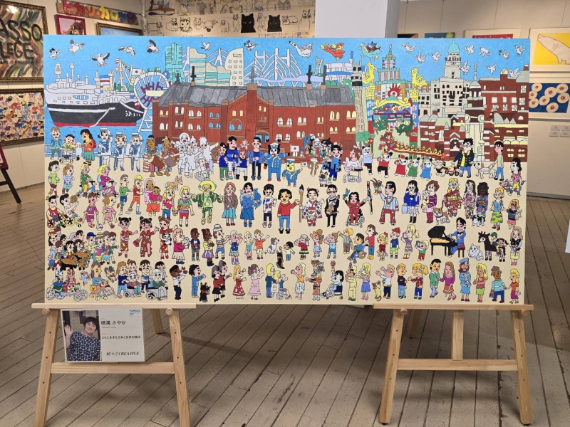 「これは日本と世界のみなさんが(赤レンガ倉庫前に)集まっている絵です。津久井やまゆり事件をきっかけに描きました」と紹介。描くのにどれくらいかかったかを聞かれ、毎日4時間描いて3ヶ月くらいかかったと回答。注目してほしいところは世界の子どもたちだと話していた。