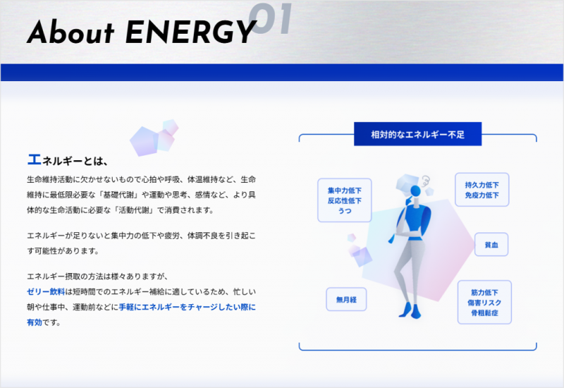 同サイトは、エネルギーとはどのようなものか、エネルギー不足になると人体にどのようなリスクを及ぼすか、エネルギー不足に陥らないための手段など、エネルギーの重要性を啓発する内容。調査結果や過去の論文、有識者のコメントなどを通して、あらゆる面で人体にとって大切なエネルギーについて学べるものとなっています。