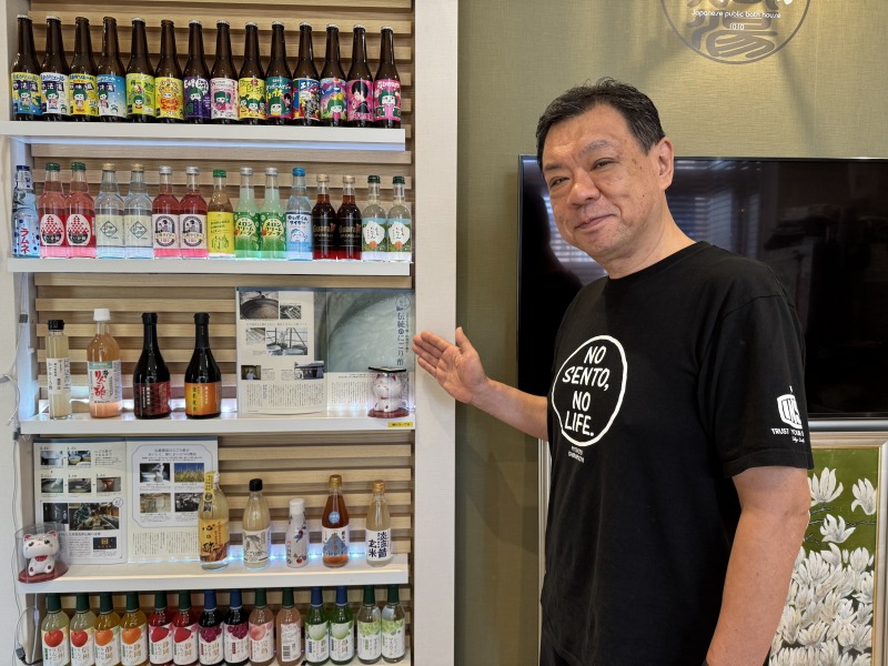 健康情報にとっても詳しい店主がにごり酢の素晴らしさに魅了されてスタートしたこのサービス。銭湯のフロント付近には種類豊富な「にごり酢」がかざられている。店主も実際に、健康を考えてにごり酢を毎日飲んでみたところ10kgのダイエットに成功したと語る。